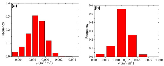 Statistical histograms of the difference between original and aggregated SM data over the whole study period (2015–2018). (a) Histogram of the mean of the differences μ and (b) histogram of the standard deviation σ of the differences.