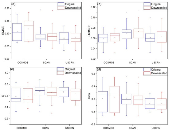 Box plots of (a) RMSE, (b) ubRMSE, (c) R, and (d) bias between the in situ SM measurements against original/downscaled SMAP SM at all network stations.