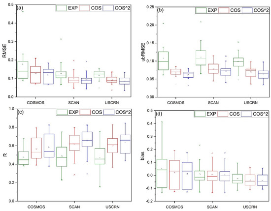 Box plots of (a) RMSE, (b) ubRMSE, (c) R, and (d) bias between the measured SM against the downscaled SM with three downscaling functions EXP: exponential form, COS: cosine form, and COS^2: cosine-square form based on the statistics over all sparse stations and grouped by their observing networks.