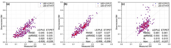 The scatter plots in Figure 11 show the comparisons between the in situ SM measurements at the CVS stations against original and downscaled SMAP SM estimates with two different LEE definitions. The scatter plots clearly show that the downscaled SM estimates using two different LEE definitions are almost identical. The very similar statistical metric values shown in Figure 11 indicate that the impact of two different LEE definitions on the performance of the DSCALE_mod16 model is negligible. Figure 12 shows the comparisons between two different LEE definitions at network stations. The mean, median and histogram distribution of the downscaled SW estimates based on two different LEE definitions are almost the same. Therefore, the use of either the ratio of latent heat flux (LE) to potential latent heat flux (PLE) or the ratio of the evapotranspiration (ET) to potential ET (PET) to define and calculate LEE does not influence the performance of the DSCALE_mod16 model.