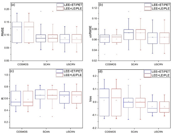Comparison between the in situ measured SM against the downscaled SM with two LEE calculation ways using box plots of (a) RMSE, (b) ubRMSE, (c) R, and (d) bias based on the statistics over all sparse stations and grouped by their observing networks.