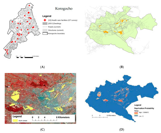 Deprived area maps of Nairobi, Kenya generated with four different approaches to deprived area mapping—(A) Aggregated deprived households (data source: Improving Health in Slums Collaborative [89]),(B) field-based mapping (data source: Slum Dwellers International (SDI)), (C) human imagery classification (data source: Faculty of Geo-Information Science and Earth Observation (ITC) [90]), and (D) machine-learning imagery classification using Sentinel-2 imagery (2019).
