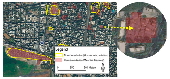 Deprived area maps derived from EO data can be of relatively high accuracy (typically ranging from 70% to 95% [10]); however, some areas may be incorrectly labeled as deprived, or some actual deprived areas may be omitted. Furthermore, showing crisp boundaries of deprived areas might cause misinterpretation of such maps and raise questioning of whether such maps should be made publicly available; for instance, maps could have severe consequences for vulnerable communities (e.g., evictions). Figure 2 compares a machine-learning-based identification of deprived areas using freely available Sentinel-2 image data with a manually delineated area map (in red) derived from VHR imagery (yellow outlines). The semi-automatic classification indicated at several locations the likelihood of small pockets of deprived areas, showing errors of commission and omission. However, at some locations, the computer detected small pockets correctly, which were omitted by the human interpreter (right zoom-in). Due to the relatively coarse resolution of the Sentinel-2 image (10 m), area boundaries are different from the manual delineation. This raises the question at what level of aggregation (scale) deprived area maps should be made available to which user groups and how to best communicate uncertainties in mapping products.