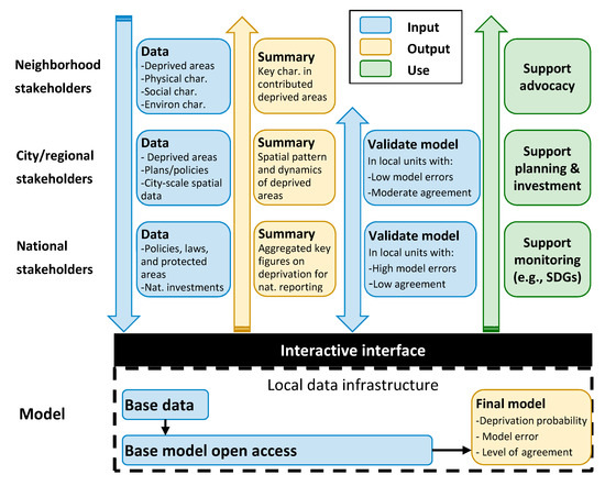 To deal with privacy and model errors, the different information needs at city and national scales, and the different types and resolution of physical and social datasets used as model covariates, the proposed IDeAMapS is meant to produce a high-resolution gridded dataset, where each grid cell is characterized by an estimated degree of “deprivation” (relating to differences in physical, environmental, and socioeconomic conditions (e.g., [61]). Gridded datasets offer high operational flexibility, because they can be aggregated within spatial or statistical units of different extents and scales, such as census enumeration areas or administrative units. Consequently, areal unit boundaries and toponyms are not explicitly embedded in the gridded data, thereby protecting the privacy and safety of the local communities. IDeAMapS will be available as a map service with a user interface (open accessed via the Web) that will allow users to classify the degree of “deprivation” into categorical area maps, by setting “deprivation” thresholds. To promote continuous improvement of the deprived area mapping system, the user interface will ask users to provide additional training data. For example, it will allow local actors to classify the cells where the model performs poorly as deprived or nondeprived. This information will be fed back into the model to continually improve its statistical performance and measure the level of agreement among local actors.