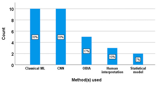 A systematic review of the literature on mapping deprived areas (i.e., slums and informal settlements) using EO-based data since 2016 identified 30 key peer-reviewed articles. The most common mapping methods are classical machine-learning (ML) (e.g., support vector machines and random forest) and CNNs, followed by rule-based object-based image analysis (OBIA) [67], human image interpretation, and statistics models (Figure 4). Most of the publications (60%) in the field of ML focus on small areas, much below the size of a city. At the scale of subcities, the potential of ML to support planning and decision-making required at the city or national scale (Figure 3) cannot be illustrated [1]. In particular, CNN-based methods focus on small areas due to the associated high computational requirements. The most common study area is the city of Mumbai, which is the focus of more than 20% of all publications (e.g., [52,54,56,91]). The reason for this is that deprived areas within the city have clear physical characteristics (i.e., deprived areas are commonly very compact, have little vegetation and cover large parts of the city) that can be easily identified through imagery classification approaches [92]. In general, almost 60% of all studies focus on Asian cities (typically the very large and mega-cities), around 20% on African cities, less than 10% on Latin American cities, and around 10% analyze transferability of cities across continents. Secondary cities are commonly not covered.
