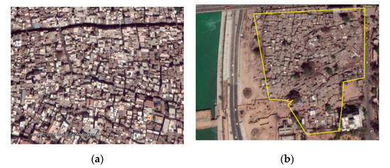 Satellite, aerial, and drone imagery are sometimes used to manually classify deprived areas using their unique physical characteristics [48]. Human imagery classification is generally based on very-high resolution (VHR) imagery from satellites (up to 30 cm resolutions) available also as freely accessible RGB images (e.g., Google Earth), drones (e.g., 3 cm resolution), or low-flying aircraft providing substantial insights into local physical conditions. This approach is usually based on a priori definitions of deprived areas, for example, defining such areas as having high built-up density, irregular layout patterns, small or no internal access roads, small low-rise buildings, and lack of green spaces [9]. The use of imagery to classify deprived areas does not depend on the availability of predefined areal units. For this reason, this approach could provide a more accurate approximation of the actual boundaries of deprived areas [8]. Local experts often perform the manual delineation of these boundaries, and while it is a labor-intensive process, it can provide high-resolution and highly accurate maps for planning purposes. However, there may be inconsistencies in areas delineated by different experts [58], as they might disagree about the classification of complex urban environments [66,86,87] and, generally, omit the role of local actors (e.g., by ignoring local opinions, privacy, and geo-ethics).