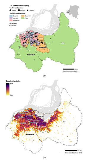 Kinshasa, Democratic Republic of the Congo; Municipal map (a) and deprivation index (b).