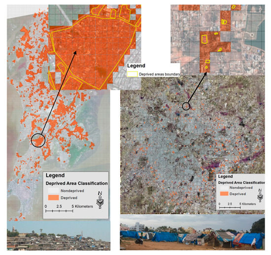For the city of Mumbai, the census of 2011 reports around a 42% slum population. These deprived areas are relatively large and can be found across the urban landscape (Figure 5 left). In general, such areas are relatively well-covered by official statistics, as they are large and have often existed for many decades, which is very different in the city of Bangalore. In Bangalore, the census reports an 8% slum population, while the Karnataka Slum Development Board [110] officially counts 597 slums (around a 23% slum population), and a local survey mapped over 1500 slums [111]. The omitted deprived areas are particularly those that are small and temporary (see ground photo, lower right) [66]. Many cities do not account for unrecognized deprived areas, and particularly, the poorest sections of the population are commonly not counted. To map the boundaries of deprived areas effectively, VHR imagery (e.g., Pleiades or WorldView) with a resolution below 1 m is required. However, to produce more aggregated grid-based maps (examples are shown in Figure 8), HR imagery (e.g., Sentinel or Planetscope) having a spatial resolution of 10m and below are sufficient for many cities. The main risk of such HR grid-based approaches is that small deprived settlements might not be well-captured (as shown for the example of Bangalore).