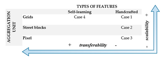 The main advantage of this approach is that the contextual features are computationally simple and relatively quick to process. Additionally, the scale of calculation can be adjusted based on the imagery or areas covered, and instead of classifying objects, the contextual features can be used directly in statistical models and provide continuous outputs [108]. The major drawback is the limited understanding of what the patterns the contextual features are picking up mean and how they vary from city to city. However, research is currently being conducted to help better understand the urban attributes environment contextual features are capturing [109].
