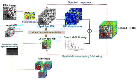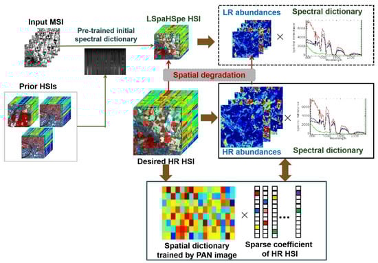 Desired HSI consists of a few spectral signatures in a spectral dictionary [32]. In Figure 3, the virtual variable LSpaHSpe has the same spectral resolution as the desired HSI and the same spatial resolution as the input MSI. Like HSpaLSpe, LSpaHSpe is also considered as an intermediate variable and therefore not be solved in the proposed process. When the high spectral resolution image covering the same scene as the input image is not available, prior HSIs with different landscapes are used to estimate an initial spectral dictionary. The utilized prior HSIs have the same spatial resolution as LSpaHSpe and they are captured by the same sensor as the desired HSI. Due to the same spectral resolution, LSpaHSpe and the desired HSI share the same high-resolution spectral dictionary, and there is a spatial mapping scheme between them. Figure 3 shows that the mapping scheme of their abundances should be in accordance with the mapping scheme between two images.