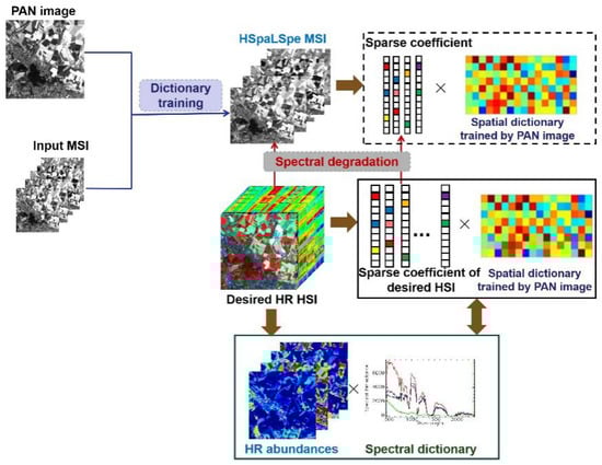 In this paper, the virtual variable HSpaLSpe is assumed to have the same spatial resolution as the desired HSI and the same spectral resolution as the input MSI. HSpaLSpe is just an intermediate variable and is not necessary to be solved. PAN image contains abundant high-resolution spatial details and structures [30], used to train an over-completed spatial dictionary via sparse representation framework [31]. In Figure 2, virtual variable HSpaLSpe has the same spatial resolution as the desired HSI. HSpaLSpe and the desired HSI are assumed to share the same spatial dictionary. A spectral degradation mapping between HSpaLSpe and the desired HSI exists. The relationship between sparse coefficients of HSpaLSpe and the desired HSI obeys the spectral degradation mapping [5]. An interactive feedback framework [11] is also utilized in the spatial observation model to simultaneously deal with spatial processing and spectral unmixing.