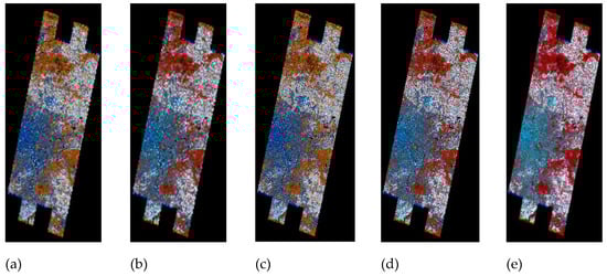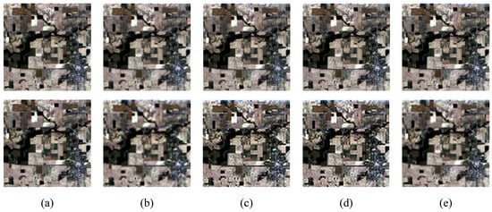 RGB compositions of (a) Indusion+Arad method, (b) Indusion+SREM method, (c) SparseFI+Arad method, (d) SparseFI+SREM method, (e) Proposed J-SpeSpaRE method.