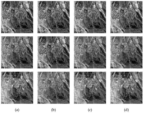 Spectral resolution enhancement comparison on Cuprite dataset, from top to bottom denote band 550 nm, 750 nm, and 1500 nm. (a) Reference HRI, spectral resolution enhancement results of (b) Arad method, (c) SREM method, (d) Proposed J-SpeSpaRE method (after spatial degradation).