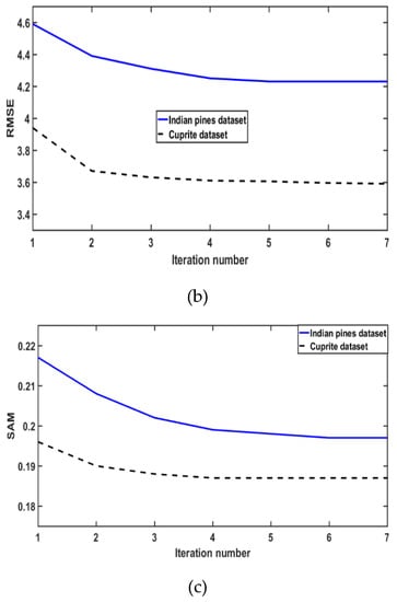 Assessment values of each iteration on both Indian pines dataset and Cuprite dataset (a) Peak Signal-to-Noise Ratio (PSNR), (b) Root-Mean-Square Error (RMSE), and (c) Spectral Angle Mapper (SAM).