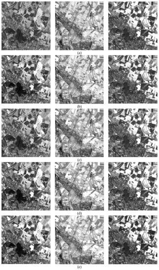 ALI/Hyperion real datasets captured by EO-1 satellite are applied to evaluate the performance of the proposed method. EO-1 satellite simultaneously carries hyperspectral Hyperion sensor and multispectral ALI sensor, where Hyperion sensor captures 242 hyperspectral bands and ALI sensor captures one PAN band and nine multispectral bands [50]. The spectral resolution of Hyperion image is 10 nm. The spatial resolutions of ALI image and Hyperion image are both 30 m. The spatial resolution of PAN image is 10 m. PAN image (10 m) and MSI (30 m) can be directly acquired to recover the corresponding HSI (10 m) using spatial dictionary trained from PAN image and spectral dictionary trained from prior HSIs (30 m) over various scenes. The selected Hyperion/ALI images are obtained in June of 2002 over the city of Paris, France. Figure 9a shows the PAN image, and RGB compositions of ALI and Hyperion images are presented in Figure 9b,c. The prior hyperspectral data used for training initial spectral dictionary are Hyperion hyperspectral data captured over the cities of Berlin, Germany, and Xi’an, China. Atmospheric correction and registration are firstly performed. Fast Line-of-sight Atmospheric Analysis in ENVI 5.3 is used for atmospheric correction [24]. The polynomial algorithm is exploited to register Hyperion image to ALI image by selecting more than 50 pairs of tie points.
