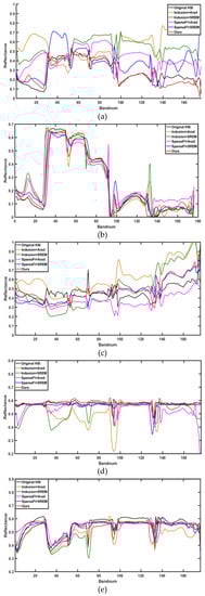Comparison of reflectance of five selected endmembers in real dataset, (a) Wood, (b) Lawn, (c) Residence, (d) Sand land, and (e) Crop land.