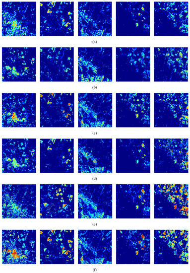 Comparison of abundance maps of the five selected endmembers in real dataset, (a) Original HSI, (b) Indusion+Arad, (c) Indusion+SREM, (d) SparseFI+Arad, (e) SparseFI+SREM, and (f) Our method.