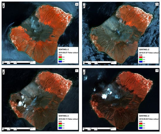 Figure 2. Sentinel-2 image (false color) collected on: (a) 7 June 2019 (pre-eruption), (b) 7 July 2019, (c) 11 August 2019, (d) 5 September 2019.