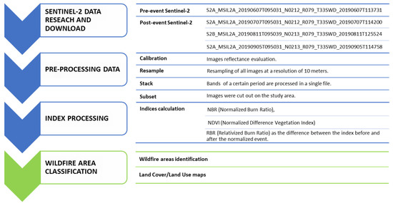 The Normalized Burn Ratio (NBR) index has been used to map the areas covered by fire, which has permitted to easily identify the areas covered by the fire and the degree of severity of a fire [10,11,12,13,14,15,16]. This index has been calculated on two Sentinel-2 images acquired on different dates before and after the wildfire (after a not excessively high number of days, especially if the area affected by the fire consists mainly of pasture or low bush).