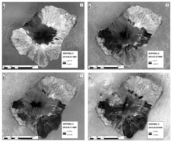Sentinel-2 images-derived NBR on: (a) 7 June 2019 (pre-eruption), (b) 7 July 2019, (c) 11 August 2019, (d) 5 September 2019. Thermal (black) anomalies in the summit area and Sciara del Fuoco in (b), and (c), are related to the effusive activity.
