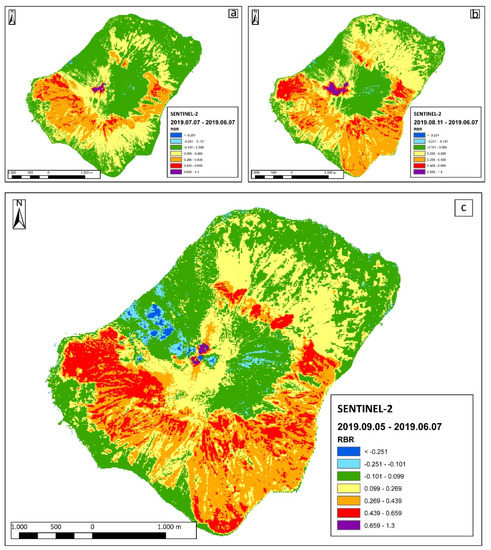 Sentinel-2 images-derived Relativized Burn Ratio (RBR) on: (a) 7 June 2019–7 July 2019, (b) 7 June 2019–11 August 2019, (c) 7 June 2019–5 September 2019.