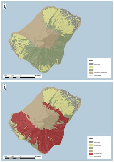 Multi-temporal LC and LU analyses have allowed to estimate not only damages in terms of loss of Aeolian endemic vegetation and agricultural heritage [32,33], but also transformations of landscape patterns related to the land management changes [34]. Until 1930s, inhabitants usually cultivated terraces up to 600–700 meters above the sea level with olive groves, vineyards, and capers, traditionally sown in promiscuous crops [20]. Following the 1930 eruption, the depopulation of the island led to agricultural woody crops abandonment and wilderness. Because of sociocultural and economic production system changes, the abandonment process has consequently caused: