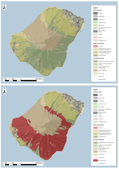 At Stromboli Island substantial transformations of land cover (LC) and land use (LU) have occurred in consequence of the 3 July and 28 August 2019 paroxysmal explosions; a strong decrease of Agricultural areas (mainly Ancient olive groves, shrubberies and Mediterranean bushes), Semi-natural vegetated areas (Shrubberies and Mediterranean bushes), and Artificial areas (mainly Industrial areas, public services and power station).