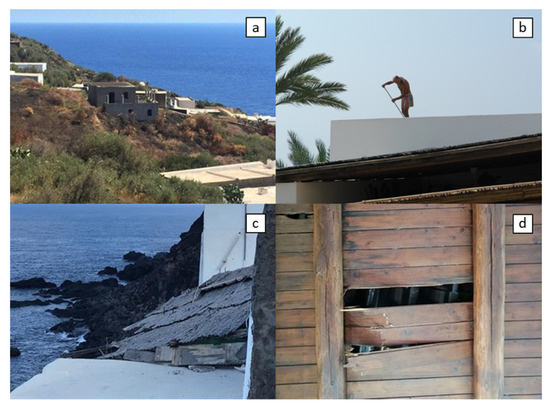 Tephra accumulation on the roofs in (a,b), damages to the canopies in (c,d) at Ginostra, following the 3 July 2019 paroxysmal explosion.