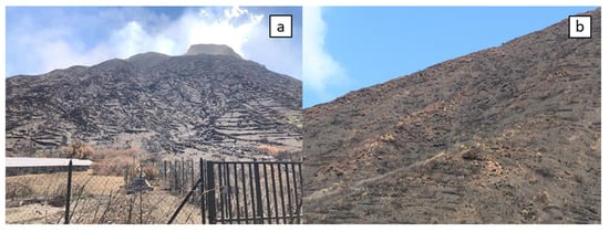 Damages to the adjacent area of the photovoltaic power station in (a), damages to the ancient terraced olive groves in (b) at Ginostra, following the 3 July 2019 paroxysmal explosion.