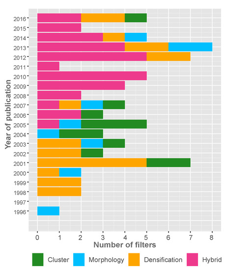 More than a decade ago, the work in [5] identified the limited efficiency of the post-processing LiDAR data as one of the challenges to be addressed by the commercial sector. This author reported that between 60% and 80% of the relevant resources are destined to the manual classification of data and the quality control. However, new and complex filtering algorithms have since been developed, supported by technological advances, free software, and the massive availability of data. Although private companies (and public bodies) are generally not transparent about the efficiency of these processes, refined manual processes of models and quality control continue to represent an important part of the workflow of commercial projects [6]. Despite the efforts made in this field, the scientific community considers that the problem has not been totally resolved, and the search for the perfect algorithm continues [7,8,9]. This is amply demonstrated by the continued production of filters over the years (Figure 1).