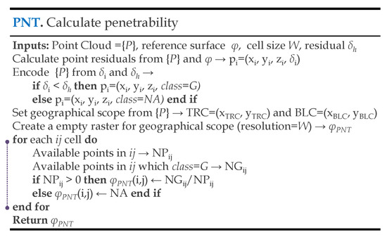 The penetrability (PNT) is defined as the ratio between the number of ground points and the number of total points in each cell. The PNT function is developed in order to calculate this variable. Figure 3 shows the pseudo-code of the PNT function. This function is defined by four parameters: input LiDAR data (P); reference terrain surface (); cell size (W); and the value of the residual from which a point is considered a non-ground point (). The difference in elevation between LiDAR points and the reference terrain surface is first calculated (). A point is considered a ground point and encoded as G, if < . A grid of square cells of size W, whose extension coincides with the zone for which data are available, is created. For each cell, the value resulting from dividing the number of points coded as G by the total number of points is calculated. Empty cells are represented as Not Available (NA). The result of the PNT function is (raster format).