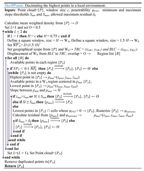 Following the studies of [22,24], we developed and used the Decimation of Highest Points function (DecHPoints) to produce a decimated point cloud (P) by detecting and deleting (under some circumstances) the highest points in a local environment from the point cloud. The underlying principle that this function applies to detect and remove non-ground points from the point cloud is that the elevations of these points are maximal in local environments. The DecHPoints function is defined by six parameters: input LiDAR data (P); the maximum size of the area without ground points (usually identified from the shortest side of the largest building in the study area (c); surface penetrability (); minimum and maximum slope thresholds (S and S); and allowed maximum residual (). The pseudo-code of DecHPoints is shown in Figure 4.