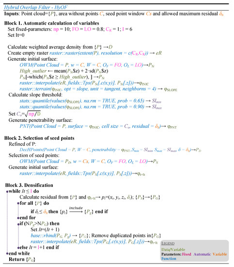 Finally, identifying the filter that best adapts to the specific needs of the user is not a simple task, as it assumes a good level of knowledge about the different filters. In many cases, such knowledge is difficult to acquire due to the lack of usability (ease of use - according to [26], usability is the degree of efficacy, efficiency, and satisfaction with which the user can achieve the specific objectives desired, within the context of the particular use. In the present case, we refer to usability only in the sense of the subjective attribute: satisfaction [27]) and accessibility (possibility of access-in computer science, the term “accessibility” refers to the design of products to be usable by people with disabilities. However, in this paper, this term refers only to the “free access” and intends to represent the opposite of what the commercial software depicts). These obstacles are exacerbated by the fact that many of the filtering details are jealously guarded by their creators [17] and are not published, while those included in commercial software act like black boxes that operate on data. In response to this situation, in this work, we present the Hybrid Overlap Filter (HyOF), a new filtering algorithm implemented in the free R software environment [28]. In addition to being aimed at reducing the number of commission errors associated with the selection of the seed points in urban areas, the algorithm also aims to respond to some of the actual needs of the users. The algorithm follows the overall scheme of most densification filters developed to date, but HyOF also incorporates a decimation process [20], making it a hybrid method.