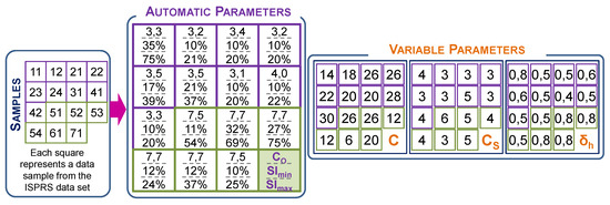 Selection of the filtering parameters is an important task determining the effectivity and efficiency of the filtering process [35] and is also one of the most important challenges facing the designers and, subsequently, the users of the filters. In most cases, selection of the optimal parameters is based on a process of trial and error, supported by the prior knowledge that the user has regarding the functioning of the filter and the characteristics of the study area. In the present study, the fixed parameter values were established on the basis of the practical experience of the authors: np = 10; LO = FO = 0.8; C = 1; and I = 6. Furthermore, the values of the parameters C, Sl, and Sl were calculated automatically during the filtering process. In the case of the variable parameters, a different strategy was used with the aim of minimizing filtering errors and optimizing the processing time in future studies. Thus, the parameters C, C, and were tuned in two stages. The reference samples were filtered by maintaining parameter constant and varying the parameters C and C, where = 0.5 m. The ranges for each parameter were as follows: for urban samples, C ∈ [12,32] at intervals of 2 m and for rural samples C ∈ [6,26] at intervals of 2 m; for all samples, C ∈ [3,6] at intervals of 1 m. Each sample was thus filtered 44 times. For each parameter, the range was determined on the basis of the practical experience of the authors. The errors TIe, TIIe, and Te and the Kappa coefficient were calculated for each combination of parameters. Thus, the combination of parameters that yielded the lowest value of Te for each sample was considered optimal at this stage. In the second stage, the parameters C and C took the optimal values obtained in the previous stage, and the value of parameter was varied, where ∈ [0.4,0.8] at intervals of 0.1 m. In this case, each sample was filtered 4 times. Finally, the set of parameters that yielded the lowest itTe was considered optimal. This approach produced 48 results per sample, compared with the 220 that would have been produced if all possible combinations of the parameters C (11 levels), C (4 levels), and (5 levels) had been considered. The optimal values of the parameters are shown in Figure 6.