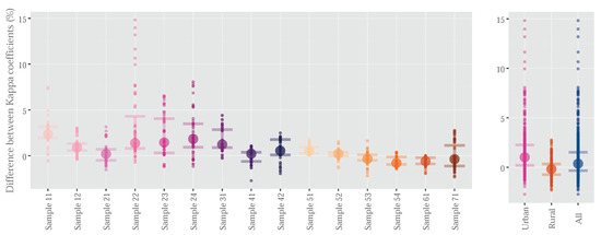 The quantitative results of the parameters fitting described in Section 3.3 were used to test the efficacy of the penetrability during the decimation process. Figure 7 was created from the difference between the Kappa coefficients derived from the decimated-point clouds using the penetrability and without using this variable (urban samples: magenta-purple boxes; rural samples: orange boxes; all samples: blue box). Positive differences indicated that the use of the penetrability increased the effectiveness of the point decimation method. As shown in Figure 7, most urban samples showed positive differences (magenta-purple boxes), while most rural samples showed zero or negative differences (orange boxes). These results may be due to the use of penetrability, which reduced the commission errors in the decimated-point clouds obtained from the decimation method. However, this reduction came at the cost of increasing the omission errors. In this way, the use of the penetrability would have a positive impact on the filtering results in areas where the reduction of the Type II errors exercised more influence than the increase of Type I errors in the final precision. Usually, this happened in areas with large buildings, where the proportion of ground-points relative to non-ground points was not high (ratio P/P in Table 3). Finally, if the urban and rural samples were taken into account (the blue box in Figure 7), the use of the penetrability provided better results (most differences were positive). In view of this analysis, in a future version of HyOF, the user will have the option to decide if he/she wants to use the penetrability.