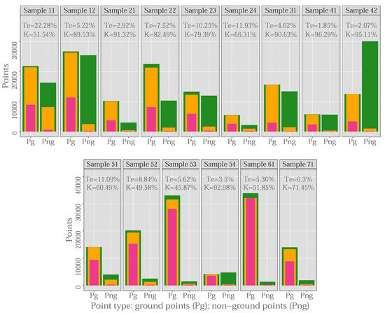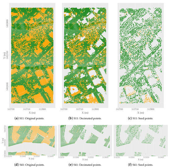 In order to test the efficacy of the decimation process using the DecHPoints function, a bar diagram (Figure 8) was constructed showing the original number of points (in green), the points remaining after the decimation process (in orange), and those selected as seed points (in pink), depending on whether they were ground points (P) or non-ground points (P). The values of Te and K were also included for each sample. The Figure 9 shows the qualitative results of our point decimation method using the ISPRS reference samples. In this figure, the spatial distribution of the original, decimated, and seed points is shown for Samples 11 (Figure 9a–c) and 41 (Figure 9d–f), which included buildings and/or vegetation. The results included in Figure 8 and Figure 9 were obtained from the optimal combination of parameters for each sample (Figure 6).