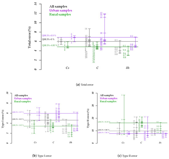 Influence of the variable parameters on the quality of the filtering process, considering all samples (in grey), the urban samples (Sample 11 to sample 42, in purple), and the rural samples (Sample 51 to sample 71, in green) using (a) total error; (b) Type I error, and (c) Type II error.