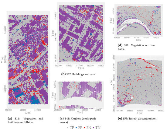 The quantitative results regarding the precision of the HyOF evaluated using the 15 ISPRS reference samples and the metrics proposed by [23] are shown in Table 4. The table includes the values of the errors TIe, TIIe, and Te and the Kappa coefficient, obtained using the optimal parameters for each sample, as well as a single combination of parameters. The final row includes the errors obtained taking into account the points in all samples together. In previous studies, calculation of the global filtering precision was obtained from the arithmetic mean value of the errors for the 15 samples [8,38]. Although this was the simplest method, it did not take into account the proportion of points of each type relative to the total number of points. To overcome this deficiency, we used the total number of points in all study areas classified correctly and incorrectly as ground points and non-ground points. In addition, the Figure 12 shows the spatial distribution of the errors for Samples 11, 12, 41, 52, and 53 represented by the True Positives (TP), False Positives (FP), False Negatives (FN), and True Negatives (TN).