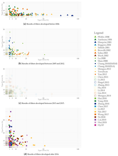 The aforementioned reflection may be due to the fact that the algorithms included in the study of [23] aimed to minimize TIIe rather than TIe (Figure 13a). However, the filters developed in the last decade minimized TIe at the cost of increasing the commission errors (Figure 13b–d). Considering the results of the first eight algorithms together produced mean values of the omission and commission errors of respectively 17.5% and 2.4%, compared with values of 5.0% and 5.6% produced by the filters developed since 2004. This could be observed in Figure 13a–d. There were some exceptions within the latter group of algorithms, such as that used by [25], in which many of the values of TIIe were lower than those of TIe (considering all samples: TIe = 15.34% and TIIe = 4.86%). These authors minimized the commission errors as they considered that they produced more negative effects in the final model than the omission errors, which simply reduced the level of detail with which the terrain was represented [38].