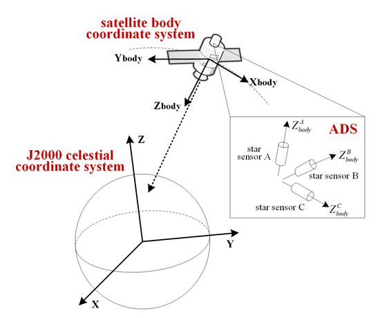 Currently, to improve the geometric accuracy, a high-resolution optical remote sensing satellite is usually equipped with star sensors as the attitude determination system (ADS), owing to its advantages in anti-jamming, resistance to drift with time, and higher measurement accuracy [6,7,8]. The star sensor utilizes a light detector to gather lines of sight from two or more stars in space and calculates the transformation matrix from the ADS coordinate system to the J2000 celestial coordinate system [9]. Then, based on the installation parameters of the star sensor in the satellite body coordinate system, the orientation of the satellite body in the J2000 celestial coordinate system can be obtained, as shown in Figure 1. Generally, three star sensors are used to ensure the accuracy of the attitude determination. As influenced by the view angle of the optical satellite during imaging, some star sensors may be exposed to the sun, or the number and distribution of stars may be insufficient for a high-accuracy attitude determination. There are usually two star sensors working simultaneously, forming a variety of star sensor combination modes for precise attitude determination. These star sensors, which belong to a common combination mode, are denoted as conventional star sensors, i.e., star sensor B and star sensor C. The alternate star sensor is considered as the unconventional star sensor, and is denoted as star sensor A. The combined mode with star sensor B and star sensor C is considered as a conventional combined mode, whereas the combined modes with star sensor A and star sensor B or star sensor A and star sensor C are regarded as unconventional combined modes.