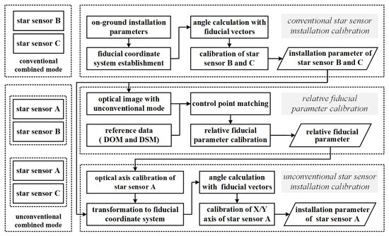 The proposed method for the on-orbit calibration of the installation parameters of a multiple star sensors system based on GCPs is divided into three parts: the installation parameters’ calibration of the conventional star sensor, relative fiducial parameters’ calibration, and installation parameters’ calibration of the unconventional star sensor, as shown in Figure 2. Star sensors B and C are regarded as the conventional star sensors. Star sensor A is considered the unconventional star sensor. Based on the on-ground installation parameters of the optical axes of star sensors B and C, the fiducial coordinate system is proposed as the calibration coordinate system. The installation parameters of the conventional star sensors are calibrated using the statistical characteristics of the angle between the axis of the star sensor and the three fiducial vectors in the J2000 celestial coordinate system. By analyzing the relationship between the conventional combined mode and unconventional combined mode, a relative fiducial model is proposed to achieve a transformation from the virtual body coordinate system decided by the unconventional combined mode to the fiducial coordinate system. Using GCPs, the relative fiducial parameters are calculated, and the installation parameter for the optical axis of star sensor A is calibrated. Based on the calibration result for the optical axis, the installation parameters of star sensor A are calibrated, based on the statistical characteristics of the angle in the unified fiducial coordinate system.