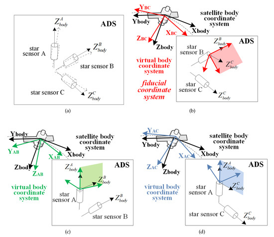 Here, are the relative fiducial parameters from the virtual body coordinate system formed by star sensors A and B and the fiducial coordinate system. are the relative fiducial parameters from the virtual body coordinate system formed by star sensors A and C and the fiducial coordinate system.