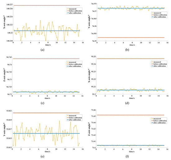With regard to the installation parameters calibration for the conventional star sensors, the angles of the coordinate axes between star sensor B and star sensor C are shown in Figure 6, and the errors of these angles (to the true values) are listed in Table 3. For the measurement data in the J2000 system, the x-axis angle of star sensor B and C is from 148.218° to 148.223°, as shown in Figure 6a. The y-axis angle is from 76.570° to 76.573°, as shown in Figure 6b. The z-axis angle is from 94.721° to 94.722°, as shown in Figure 6c. As the measurement accuracy of the horizontal axis is lower than that of the optical axis, the distribution range of the x-axis angle and y-axis angle of star sensors B and C is larger than that of the z-axis angle, further influencing the differences in calibration accuracy among the three axes. As listed in Table 3, the errors of the x-axis angle, y-axis angle, and z-axis angle are −1.524″, −0.669″, and −0.159″, respectively. The calibration accuracy of the optical axis is higher than that of the horizontal axis. This is because the calibration accuracy of the z-axis is only influenced by the measurement accuracy of the optical axis, whereas the calibration accuracies of the x-axis and y-axis are subjected to the measurement accuracies of both the optical axis and horizontal axis in the proposed method.