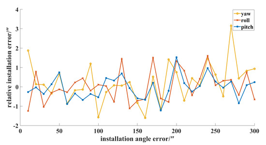 To analyze the accuracy and reliability of the proposed method under different installation angle errors, some simulated data were tested with installation angle errors from 10″ to 300″, with a space of 10″, and the relative installation errors between star sensors B and C are shown in Figure 8. The time of the experimental data is 10 s, and the frequency is 4 Hz. With the increase of the installation angle error, the calibration error remains steady, and distributes between −1″ to 1″. The relative installation errors with the installation angle error of 300″ are close to those with the installation angle error of 10″, which approximates the measurement accuracy of the optical axis. This demonstrates that the proposed method can be used to calibrate the installation parameters of star sensors with any installation angle error, and that the calibration accuracy of the proposed method is only related to the measurement accuracy of the optical axis, and not the value of the installation angle error.