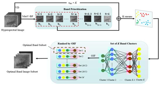Hyperspectral data generally have very high band correlation and data redundancy. In order to mitigate this problem, a BS method with target constraints, called constrained-target optimum index factor BS (CTOIFBS), is developed in this paper. It first prioritizes all bands by MinV-BP to obtain a band priority sequence. The smaller the variance, the higher the priority of the band, and the stronger the ability of the band to represent the target. It is then followed by estimating virtual dimensionality (VD) [,,,] to determine the required number of bands, nBS, where VD is defined as the number of spectrally distinct signal sources present in the data that can effectively characterize the hyperspectral data from a perspective view of target detection and classification. In this case, the first n bands with higher priorities in the sequence are clustered into nBS clusters by a K-means method to remove the band correlation. As a result, the band correlation in the same cluster will be high, while the band correlation between different clusters will be low. Finally, a band is selected from each cluster to form a band subset. The OIF value of the band subset is then calculated. The band subset with the largest OIF value is selected as the best band subset. The CTOIFBS process is as follows.