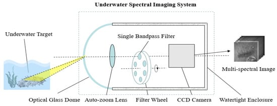 Therefore, this paper builds an underwater spectral imaging system based on a filter wheel spectral camera, as shown in Figure 2. Its main components include a FLIR Blackfly S USB3 CCD camera and its corresponding lens, electric filter wheel, and single band-pass filters with the wavelengths between 400 and 830 nm at intervals of 10 nm. These filters have a bandwidth of 14nm and a cut-off depth of OD3 and a single chip microcomputer for controlling the camera and filter wheel. All the above parts are packed in a watertight enclosure. This system uses electric filter wheels to collect single-band images in different bands and synthesize the target’s spectral image. It is also possible to obtain spectral images of different band subsets by replacing the filter combinations on the filter wheel. It is important to note that the spectral filter wheel designed is not limited to the USI system and can be applicable to various beam splitters, such as LCTF, acousto-optic tunable filter (AOTF), or spectral filter array (SFA) according to their application scenarios and costs.