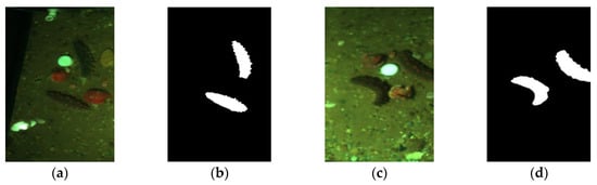 The data used in our experiments were underwater sea cucumber images collected by a hyperspectral imager, covering 256 bands with a spectral range of 0.4 to 1.05 nm. Due to the fast attenuation of infrared bands in underwater, the sensor could not collect enough information from infrared bands. So, part of the infrared bands (171–256) were removed, and only 1–170 bands were analyzed for experiments with a spectral coverage of 0.4~0.825 nm. Shown in Figure 5a,b are the RGB images of the calibrated data and their corresponding mask image, respectively.