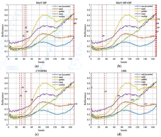 We have plotted the spectra for five types of ground features, including the sea cucumber, sand, pebble, clam, and scallop from calibrated data, as shown in Figure 5a, where the sea cucumber was selected as the target of interest and the other four features as the background. The obtained spectra were used to mark the spectral bands location (points) selected by the four BS methods in Table 4, which is shown in Figure 6 using red vertical dashed lines for visual inspection and comparison among correlation of the selected band sets.