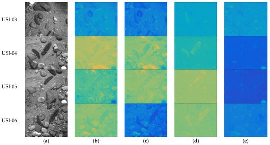 According to the detection results, both methods are capable of detecting sea cucumbers. From the performance of suppressing non-target pixels, although the image extracted from the HSI data can suppress the main background, which is sand, it has a high response to interference targets, such as stones and clams. By contrast, the data collected by the USI system can suppress non-target pixels more effectively. From the AUC values of (PD, PF) in Table 10, the AUC value detected using the data collected by the USI system is higher than that using HSI data, indicating that its ability to detect targets is higher. Of course, due to the difference in the performance of the sensors used by the two methods, this experiment may not have sufficient evidence to conclude that the detection results based on the data collected by the USI system must be better than the data using the corresponding band of HSI. Nevertheless, it can prove that the data collected using the USI system has the same feature expression ability as the hyperspectral images and can be used for underwater spectral data collection and target detection.