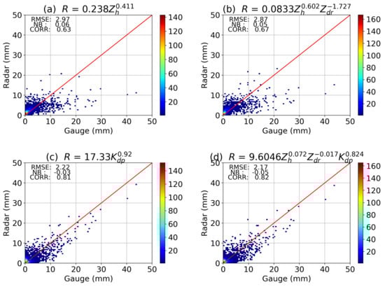 Comparison between hourly rain amounts of RG and MZZU radar: (a) , (b) , (c) , (d) . The data were collected between 6 April 2016 and 2 June 2018.